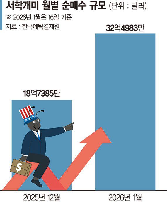 18일 한국예탁결제원 세이브로(SEIBro)에 따르면 지난 2일부터 16일까지 서학개미의 미국 주식 순매수 규모는 32억4983만달러(약 4조7951억원)로 집계됐다. 이는 지난해 12월 한 달간 순매수 규모인 18억7385만달러를 이미 크게 웃도는 수준이다. 새해 들어 미국 증시로 이탈하는 자금의 속도가 이례적으로 빠르다는 평가가 나온다.
