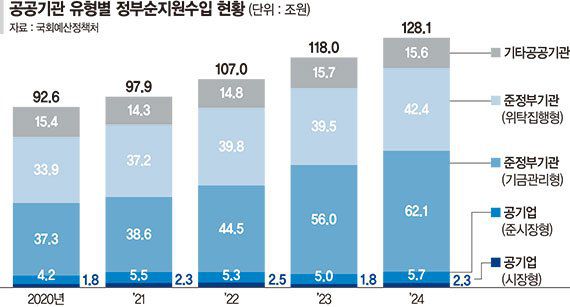 비정규직 임금이 상승할 경우 정부 재정 부담이 커질 수 있다는 우려도 나온다. 공공기관 유형별로 비정규직이 투입되는 사업 상당 부분이 국가 재정에 의존하고 있기 때문이다. 예정처에 따르면 2024년 정부순지원수입은 128조557억원으로, 2023년(117조9943억원) 대비 10조614억원(8.5%) 증가했다. 정부순지원수입은 정부 예산에 편성돼 공공기관에 직접 교부되는 재원을 의미한다. 공공기관 전체 총수입에서 정부순지원수입이 차지하는 비중 역시 2024년 13.5%로 전년 대비 0.6%p 늘었다.