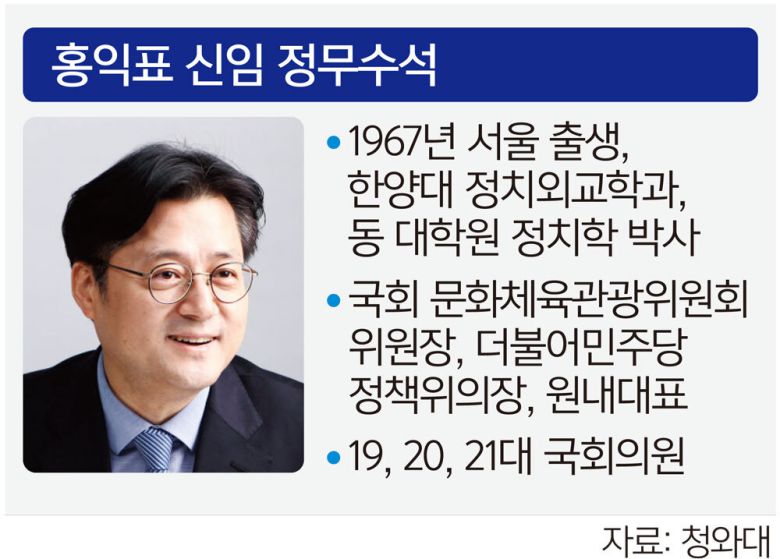 홍 전 원내대표는 민주당 정책위의장, 국회 문화체육관광위원장 등을 지낸 3선 중진 의원 출신이다. 이재명 대통령이 당 대표이던 시절 원내대표로 호흡을 맞춘 경험이 있으며, 개혁성과 합리성을 두루 갖췄다는 평가를 받는다.