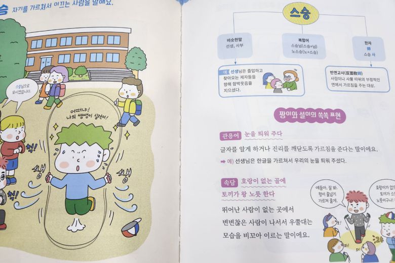 이 같은 구성보다 더 흥미로운 점은 각 장의 짜임새다. 예컨대 3장 ‘와글와글 학교생활’ 편을 보자. 스승이란 낱말에 대해 ‘자기를 가르쳐서 이끄는 사람을 말해요’라는 뜻풀이는 “어떠냐, 나의 쌩쌩이 실력이!’라는 짱이의 허세에 “스승님으로 모시겠습니다”는 친구들 맞장구가 표현된다.