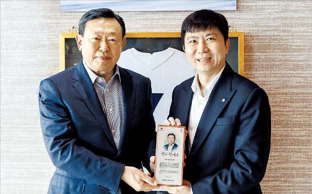 신동빈(왼쪽) 롯데그룹 회장이 16일 유승민 대한체육회장으로부터 감사패를 받고 있다./대한체육회