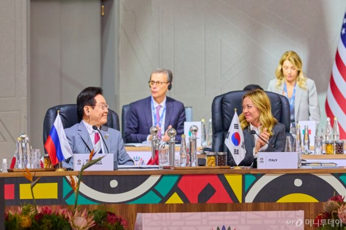 (서울=뉴스1) 이재명 기자 = 이재명 대통령이 22일(현지시간) 남아프리카공화국 요하네스버그 엑스포 센터에서 열린 G20 정상회의 제1세션에서 발언을 마치고 조르지아 멜로니 이탈리아 총리를 바라보고 있다. (이재명 대통령 SNS. 재판매 및 DB 금지)  2025.11.25/뉴스1  Copyright (C) 뉴스1. All rights reserved. 무단 전재 및 재배포,  AI학습 이용 금지.