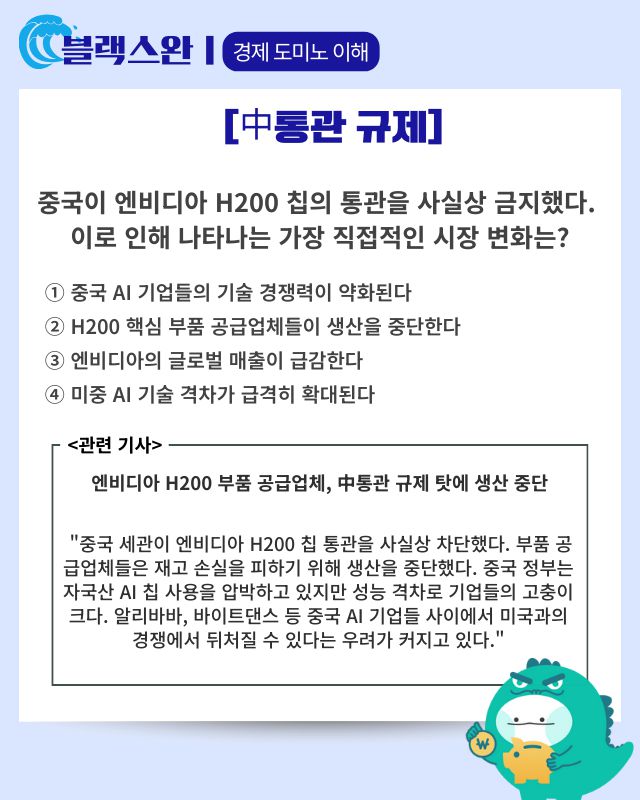 ▶ 기사 바로가기: 엔비디아 H200 부품 공급업체, 中통관 규제 탓에 생산 중단