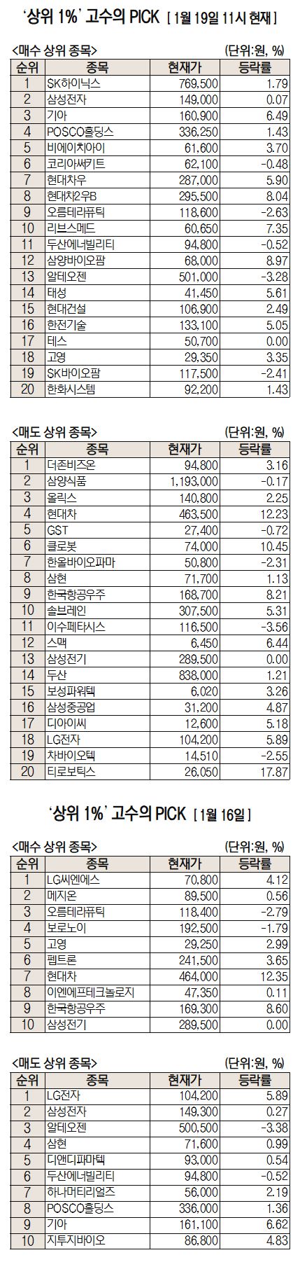 미래에셋증권은 자사 고객 중에서 지난 1개월간 수익률 상위 1% 투자자들의 매매 종목을 집계해 실시간·전일·최근 5일 기준으로 모바일트레이딩시스템(MTS) 상에서 공개하고 있다. 이 통계 데이터는 미래에셋증권의 의견과 무관한 단순 정보 안내이며 각각의 투자자 개인에게 맞는 투자 또는 수익 달성을 보장하지 않는다. 또 테마주 관련종목은 이상 급등락 가능성이 있으므로 유의해야 한다.