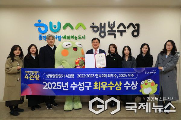 (대구=국제뉴스) 백운용 기자 = 김대권 수성구청장은 "수성구 주민 모두가 성평등한 환경에서 생활할 수 있도록 꾸준히 노력해 온 결과로 대구시가 9개 구·군을 대상으로 실시한 '2025년 성별영향평가 구·군 수행평가'에서 최우수상을 수상했다"고 말했다.