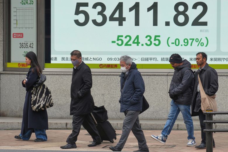 19일 일본 도쿄의 한 증권사 앞을 시민들이 지나가고 있다. [AP] |