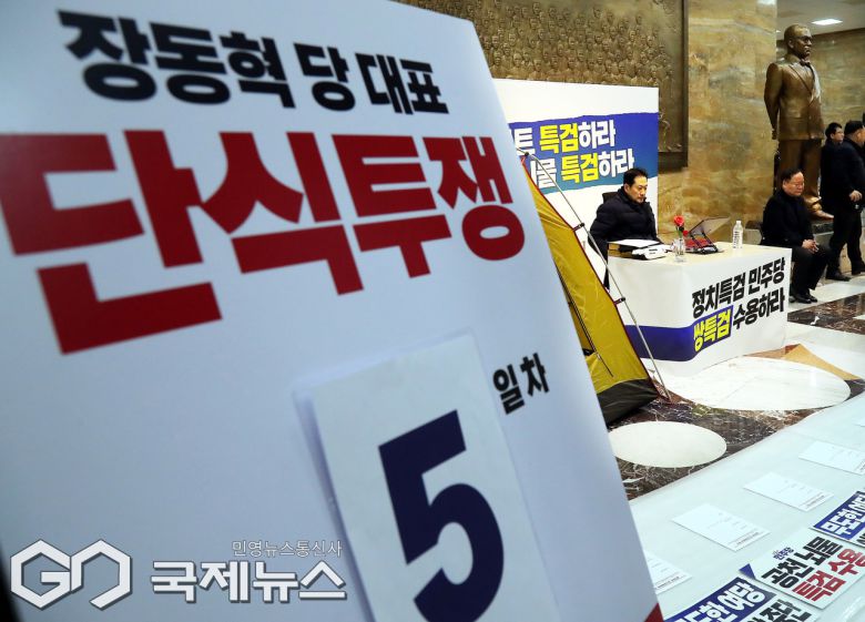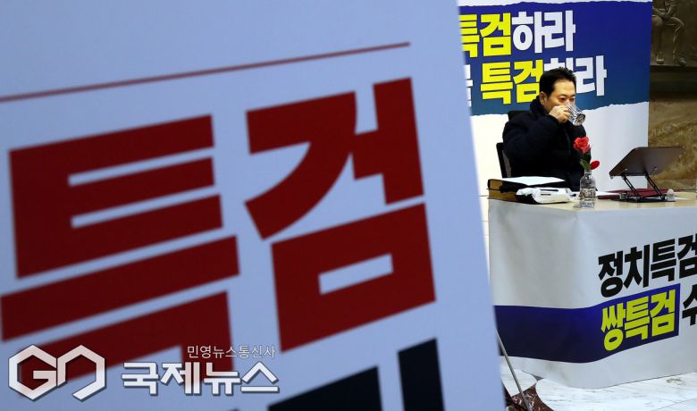 (서울=국제뉴스) 장동혁 국민의힘 대표가 19일 오전 서울 여의도 국회 로텐더홀에서 '민주당의 공천 뇌물·통일교 게이트 특검 수용'을 촉구하며 단식농성을 하고 있다./사진=이용우 기자