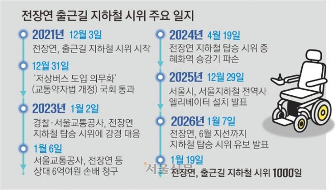 2021년 12월 3일 시작해 4년 넘게 이어진 전장연의 지하철 시위는 교통약자 이동권에 대한 사회적 관심을 환기하고 관련 제도와 정책 변화를 이끌어냈다는 평가를 받는다. 지하철 시위 이후 교통약자법 개정안이 시행되면서 노후 시내버스는 휠체어 탑승이 가능한 저상버스로 바뀌게 됐다. 지난해 말 서울시는 서울지하철 338개 역사에 엘리베이터 설치를 완료했다고 발표했다.
