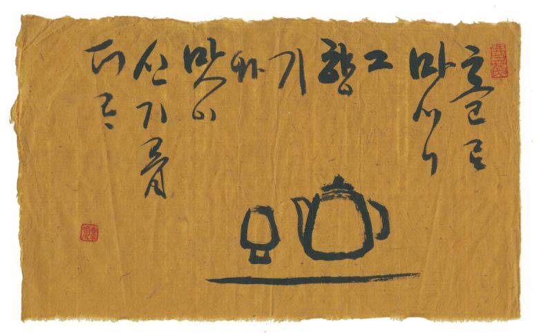 찻주전자와 찻잔을 그리고 홀로 차를 마시는 즐거움을 붓글씨로 적은 법정 스님의 작품. /맑고향기롭게 제공 |