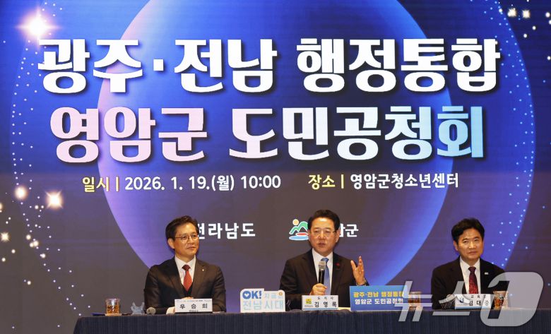 김영록 전남도지사가 전남 영암군 청소년센터에서 열린 '광주전남 행정통합 도민공청회'에서 우승희 영암군수, 김대중 전남교육감 등과 함께 주민과 질의 응답을 하고 있다. (자료사진) /뉴스1 ⓒ News1 김태성 기자