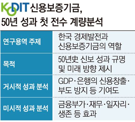 19일 본지 취재를 종합하면 신보는 최근 ‘한국 경제발전과 신용보증기금의 역할’을 주제로 한 연구용역을 발주했다. 올해 창립 50주년을 맞아 그간 운영해온 보증 정책 전반을 통합해 계량 분석하는 것은 이번이 처음이다.
