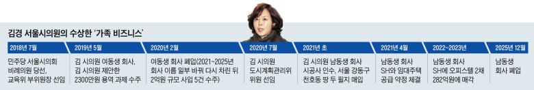 더불어민주당 ‘1억 공천 뇌물’ 사건 피의자인 김경 서울시의원의 가족 회사가 서울시의 임대주택 공급 사업을 수주해 282억원의 매출을 올리기 전, 김 시의원은 해당 사업을 심의하는 시의회 도시계획관리위원회로 자리를 옮겼다. 이후 김 시의원 가족 회사가 해당 사업을 마무리하자, 김 시의원은 상임위를 사업과 관련 없는 곳으로 옮기고 회사는 폐업한 것으로 19일 확인됐다. 이런 가운데 김 시의원 가족 회사들이 수백억 원대 규모의 서울시 사업을 수주하는 과정에서 김 시의원이 영향력을 행사했을 가능성이 있다는 의혹<본지 1월 19일 자 A5면>이 제기되자, 서울시는 이날 감사에 착수했다.