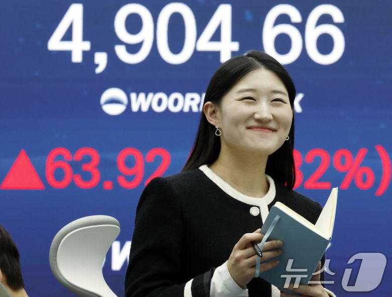 19일 오후 서울 중구 우리은행 본점 딜링룸 전광판에 종가가 표시되고 있다. 이날 코스피는 전 거래일 대비 63.92포인트(1.32%) 오른 4904.66, 코스닥은 77.90포인트(1.44%) 오른 969.09으로 장을 마쳤다. 2026.1.19/뉴스1 ⓒ News1 박정호 기자 |