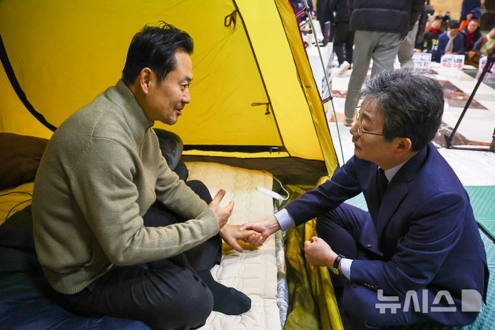 [서울=뉴시스] 김명년 기자 = 유승민 전 의원이 20일 오전 서울 여의도 국회 로텐더홀에서 통일교·공천헌금 '쌍특검'을 요구하며 엿새째 단식농성중인 장동혁 국민의힘 대표를 찾아 손을 잡고 대화하고 있다. 2026.01.20. kmn@newsis.com