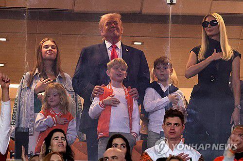 가족과 대학미식축구 경기 관람하는 트럼프[AFP 연합뉴스]