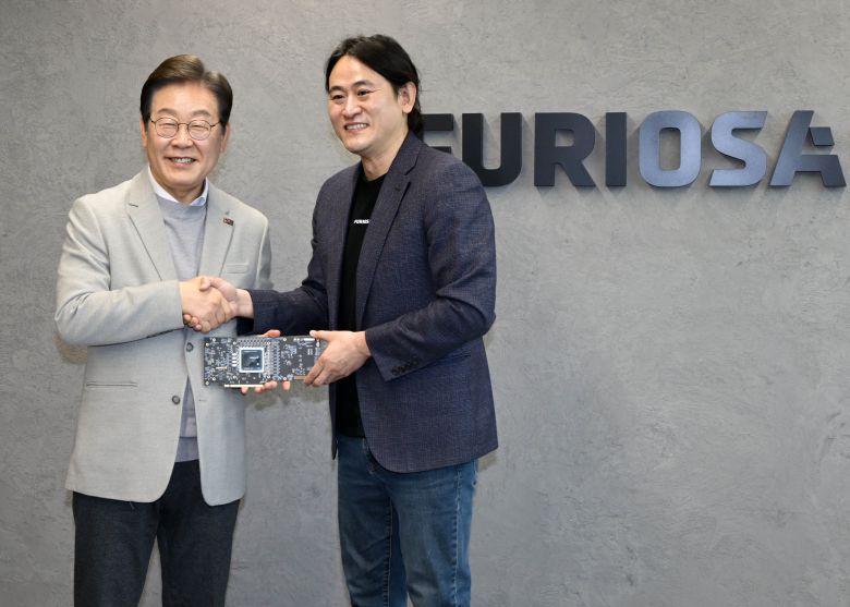 지난해 4월 이재명 대통령이 서울 강남구 퓨리오사AI에서 백준호 퓨리오사AI 대표와 기념촬영을 하고 있다./뉴스1 |