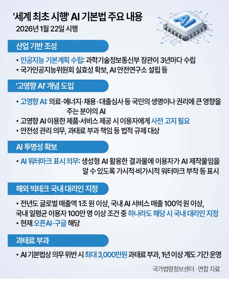 세계 최초 ‘인공지능(AI) 기본법’이 22일 국내에서 전면 시행된다. 시행을 앞두고 업계의 혼란과 우려가 커지고 있다.