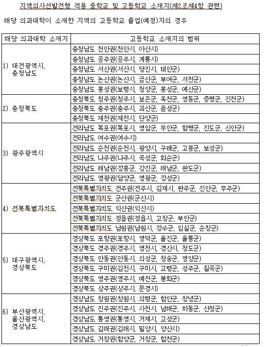 지역의사 선발전형은 서울을 제외한 9곳 권역 32개 의과대학에 도입될 예정이다. △대전광역시, 충청남도 △충청북도 △광주광역시 △전북특별자치도 △대구광역시, 경상북도 △부산광역시, 울산광역시, 경상남도 △강원특별자치도 △제주특별자치도 △경기도, 인천광역시다.