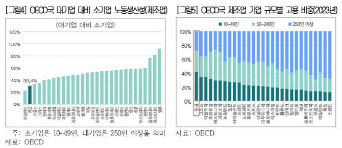 문제는 고용 구조에서도 드러난다. 한국 제조업에서 소기업의 고용 비중은 42.2%로 경제협력개발기구(OECD) 국가 중 가장 높다. 반면 소기업의 노동생산성은 대기업의 30% 수준에 불과해 생산성과 고용의 미스매치가 구조적으로 고착화됐다는 평가다. SGI는 이 같은 구조가 경제 전반의 효율성을 떨어뜨리고 저성장을 고착시키는 요인이라고 지적했다.