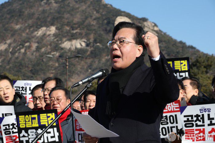 [서울=뉴스핌] 정일구 기자 = 송언석 국민의힘 원내대표와 당 소속 의원들이 20일 오전 서울 종로구 청와대 분수대 앞에서 열린 통일교 게이트·더불어민주당 공천뇌물 특검 촉구 규탄대회에서 구호를 외치고 있다. 2026.01.20 mironj19@newspim.com