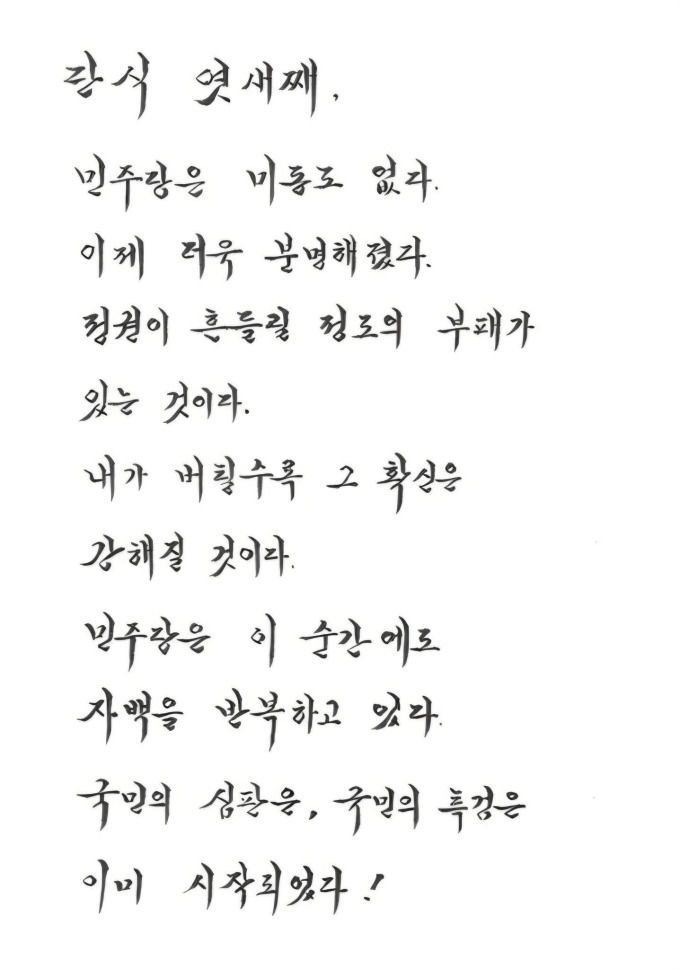 장 대표는 잠시 로텐더홀을 벗어나 국회 본청 앞에서 짧게 산책을 했다. 장 대표는 기자들에게 "6일 만에 밖에 나와 보니 매일 보던 풍경인데도 공기가 새로운 느낌"이라며 "반드시 변화는 올 것"이라고도 말했다.