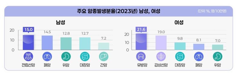 특히 남성의 경우 처음으로 전립선암이 폐암을 제치고 1위를 차지했다. 그다음 폐암(22년 1위) - 위암 - 대장암 - 간암 - 갑상선암 순으로 이어졌다.