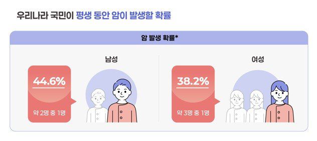 ● 평생 암 걸릴 확률 남자 44.6%, 여자는 38.2%