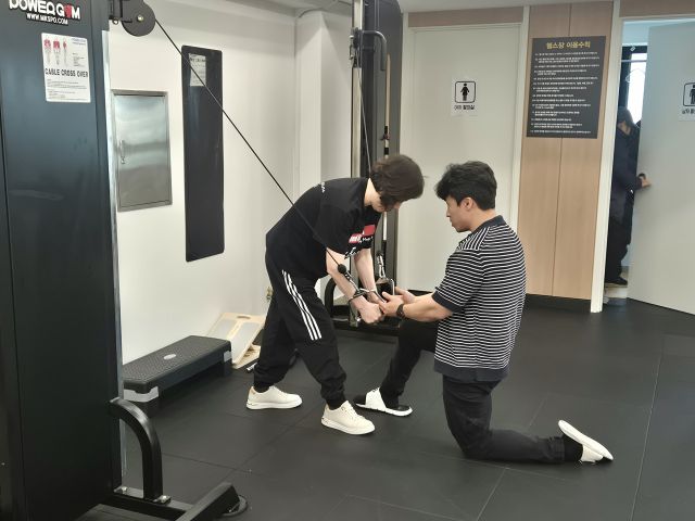 헬스장에는 사회복지사와 체육지도사 등 5명이 상주하며 운동을 돕고 있다. 실제 한 이용객이 “기구 이용법을 모르겠다”고 말하자 장애인 체육지도사 홍성윤(33) 씨가 곧바로 다가가 “가슴을 펴고 팔꿈치를 더 내려야 한다”며 자세를 잡아주기도 했다. 요청 시 개인 트레이닝도 무료로 제공된다. 홍 씨는 “장애인은 운동 습관이 잡혀 있지 않은 경우가 많아 정확한 자세로 운동하는 것이 무엇보다 중요하다”고 강조했다.
