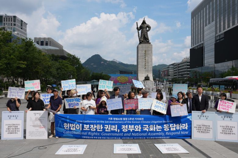 ‘기후 헌법소원’을 제기했던 ‘청소년기후소송’, ‘시민기후소송’, ‘아기기후소송’, ‘탄소중립기본계획 헌법소원’ 청구인들과 변호인단이 지난해 8월27일 서울 광화문광장에서 헌법재판소 결정 1주년을 맞아 기자회견을 하고 있다. ‘기후 헌법소원’ 청구인·변호인단 제공