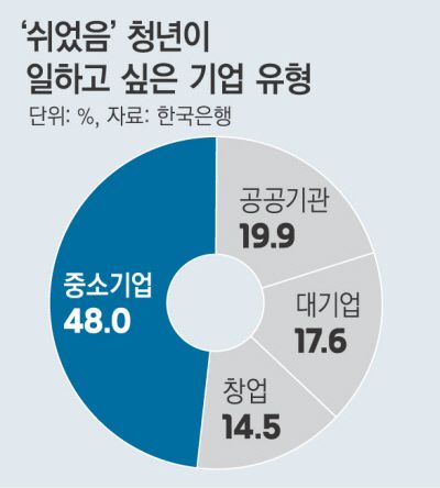 쉬었음 청년들이 중소기업을 원하는 비중(48%)도 공공기관(19.9%), 대기업(17.6%), 창업(14.5%)보다 높게 나타났다. 대기업과 공공기관을 가장 선호한 다른 유형의 미취업 청년들보다 오히려 눈높이가 낮았다. 한은은 “일자리 기대치가 높지 않은데도 노동시장 진입에 여전히 어려움을 겪는 청년들이 많다는 점을 시사한다”고 밝혔다.