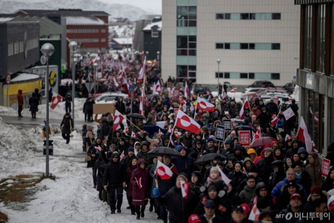 그린란드 수도 누크에서 주민 수천 명이 17일 거리로 나와 미국의 병합 시도에 반대하는 시위를 벌이고 있다. /로이터=뉴스1 /사진=(누크 로이터=뉴스1) 강민경 기자 |