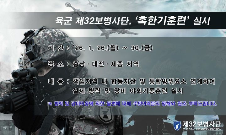 [서산=뉴시스] 육군 제32보병사단 혹한기 훈련 실시 공식 홍보물. (사진=육군 제32보병사단 제공) 2026.10.20. photo@newsis.com *재판매 및 DB 금지 |