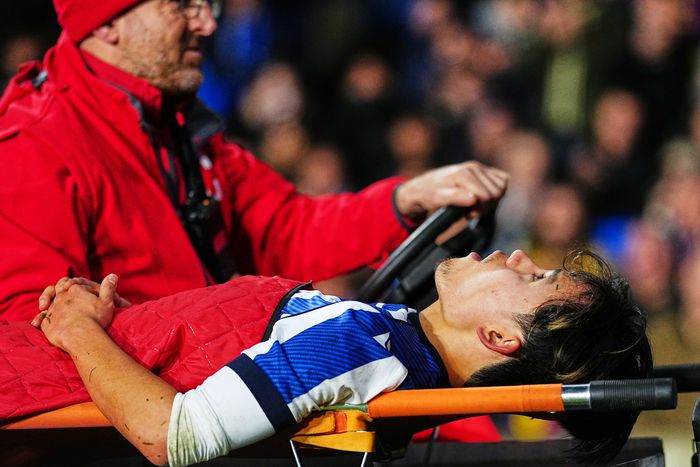 레알 소시에다드의 구보 다케후사가 19일 홈에서 열린 바르셀로나와 2025~2026시즌 스페인 라리가 20라운드 경기에서 후반 21분 부상으로 쓰러진 뒤 들것에 실려 나가고 있다. 사진 | AP연합뉴스 |