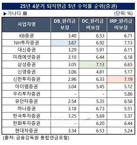 2025년 4분기 기준 증권사 DC 원리금비보장 5년 수익률 1위는 삼성증권(7.13%)으로 나타났다. 2위는 NH투자증권(6.92%), 3위는 하나증권(6.73%)였다.