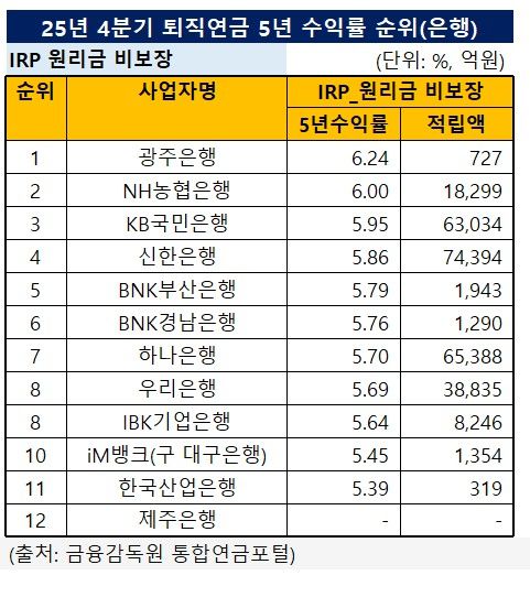 IRP 5년 수익률 역시 농협은행이 6.00%로 5대은행 중 가장 높았다. 국민은행이 5.95%로 근소하게 뒤를 쫓았으며, 신한은행 5.86%, 하나은행 5.70%, 우리은행 5.69%순으로 촘촘하게 배치됐다.