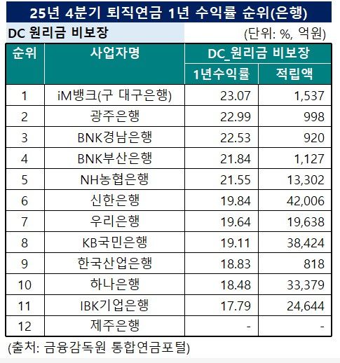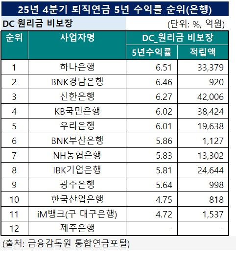 4분기 기준 DC형 퇴직연금 1년 수익률에서는 지방은행들이 20%대로 강세를 보인 가운데, 5대 은행 중에서는 농협은행이 21.55%로 가장 수익률이 높았다. 이어 신한은행이 19.84%, 우리은행이 19.64%, 국민은행이 19.11%를 각각 기록했고, 하나은행은 18.48%로 주요 은행 중 가장 낮은 DC형 1년 수익률을 나타냈다.