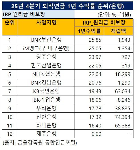 IRP 1년 수익률에서도 지방은행이 강세를 보이는 가운데, 농협은행은 5대은행 중 유일하게 22.04%로 20%대 수익률을 기록했다. 이어 국민은행이 19.43%, 우리은행 17.78%, 신한은행 17.32%, 하나은행 16.40% 순이었다.
