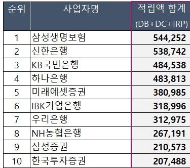 반면 IRP형에서는 은행들의 강세가 유지됐다. 신한은행(19조5132억원), 국민은행(19조2444억원), 하나은행(16조2621억원)이 나란히 TOP3를 지킨 가운데, 우리은행도 11조3100억원으로 5위에 자리하며 굳건한 모습을 보였다.