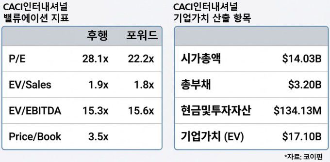 성장 전망과 현금창출 능력이 탄탄해 보이는 CACI에도 위험 요인이 있다. 정부 지출 우선순위의 급격한 변화, 저비용을 위시한 경쟁 기술의 부상 가능성 등이다. 또 ARKA 인수로 순부채가 작년 9월까지 연간 EBITDA의 2.6배에서 2026년 3월 31일 기준 4.3배로 상승할 것으로 전망되는 등 재무 부담이 커지는 점도 주시해야 한다.