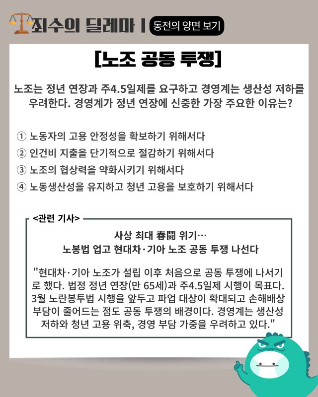 - 핵심 요약: 현대차·기아 노조가 설립 이후 처음으로 공동 투쟁에 나서 법정 정년 연장(만 65세)과 주4.5일제 시행을 요구키로 했다. 3월 노란봉투법 시행으로 파업 대상이 확대되고 손해배상 부담이 줄면서 금속노조가 산하 하청노조에 원청 직접 교섭을 독려하는 공문까지 발송한 상태다. 한국의 시간당 노동생산성은 44.4달러로 OECD 평균 56.5달러에 비해 현저히 낮아 근로시간 단축과 정년 연장 시 인건비 부담이 가중될 수밖에 없는 구조다. 미국 관세와 차세대 사업 투자를 병행해야 하는 상황에서 경영진은 노사 리스크 관리와 생산성 제고 방안을 동시에 마련해야 할 과제에 직면했다.