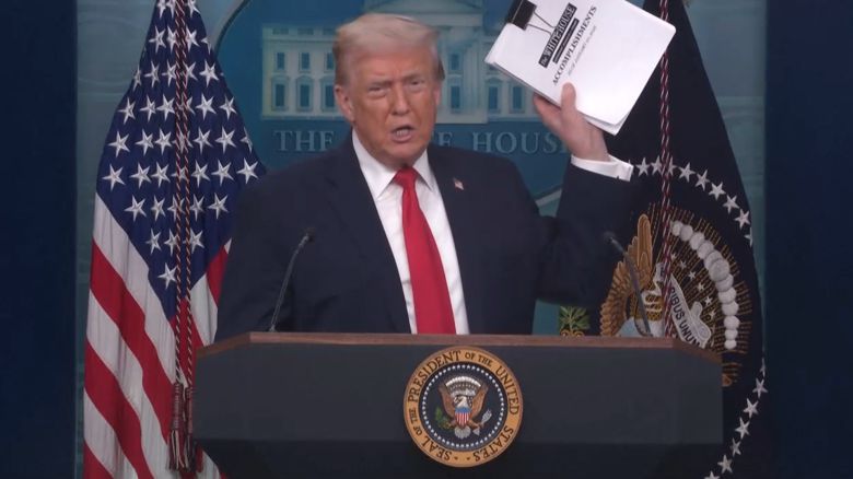 트럼프 대통령은 자신의 '업적'이라는 표지가 달린 두툼한 서류뭉치를 들고와서 지난 1년간 한 일들을 소개했는데요.