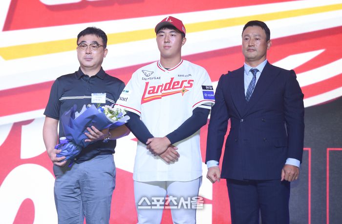 대구고 김민준이 17일 서울 송파구 롯데호텔 월드에서 열린 2026 KBO 리그 신인드래프트에서 SSG에 지명된 후 기념촬영을 하고 있다. 사진 | 최승섭 기자 thunder@sportsseoul.com