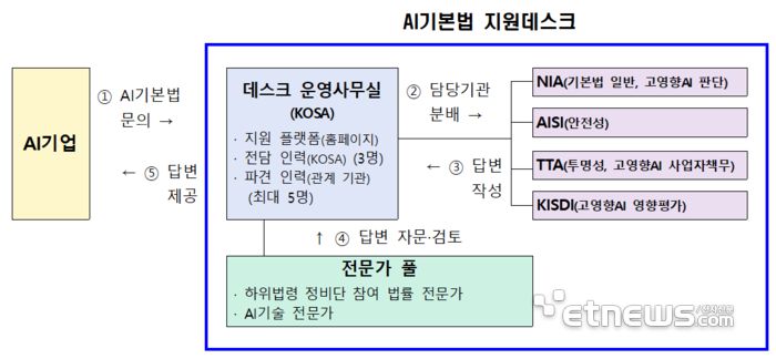 과기정통부는 법·규제의 모호성 해소와 이행이 어려운 벤처·스타트업을 위해 컨설팅을 지원하기 위한 'AI기본법 지원센터'를 운영한다.