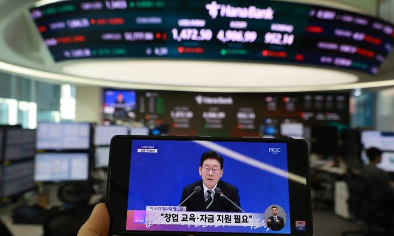 21일 오전 서울 중구 하나은행 딜링룸 전광판에 이재명 대통령 신년 기자회견 뉴스화면이 나오고 있다. 정용일 선임기자 yongil@hani.co.kr