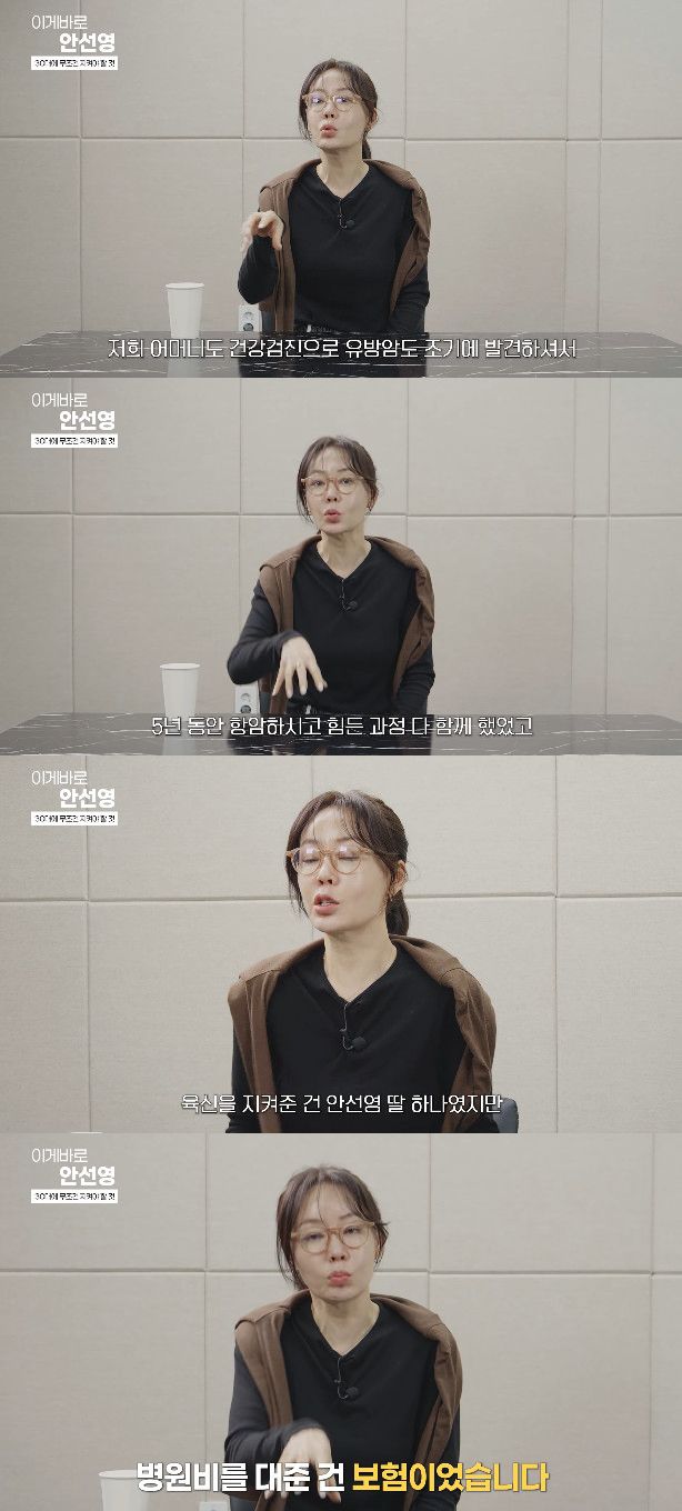 이어 안선영은 "매년 나라에서 해 주는 건강검진 꼭 받아라. 저희 어머니도 건강검진으로 유방암 초기에 발견하셔서 5년 동안 항암하시고 힘든 과정 다 함께했다. 그때 엄마의 육신을 지켜 준 건 안선영 딸 하나였지만, 병원비를 대 준 건 보험일 거다"라고 밝혔다.