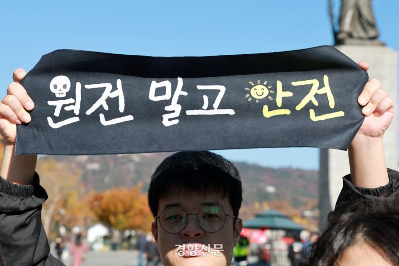 기후위기비상행동, 탈핵시민행동 등 시민단체가 지난해 11월14일 서울 광화문광장 이순신 동상 앞에서 ‘고리 원전 2호기 원안위 수명연장 승인 규탄’ 기자회견을 하고 있다. 정지윤 선임기자
