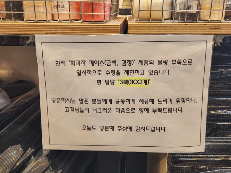 베이커리용품과 포장용품 등을 파는 업체가 모인 방산시장 상인들은 생각지 못한 상황에 당혹감을 전했다. ㅅ사 영업본부 박정수 차장은 “원래 화과자 케이스 매출에서 1구짜리가 차지하는 비중은 20∼30% 수준이었는데 최근에는 80% 이상으로 급증했고, 매일 오후 3∼4시쯤이면 1구 케이스는 완판된다. 두달 전부터 구매 수량을 제한하고 있다”며 “10년 넘게 일하면서 특정 물품이 이렇게까지 많이 팔리는 건 처음 봤다”고 말했다. 방산시장에서 베이커리용품을 주로 파는 한 소규모 업체 관계자도 “화과자 케이스나 유산지 컵을 찾는 손님이 체감상 10배는 늘어난 것 같다”고 말했다.