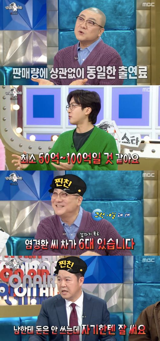 김구라는 “아니다. 네가 생각한 만큼 출연료 많이 못 받는다”라고 했지만, 전민기는 “그럼 최소 50억에서 100억 될 것 같다”라고 말했다. 이에 염경환은 “아니다. 연예계 최저가”라고 못 박았다.