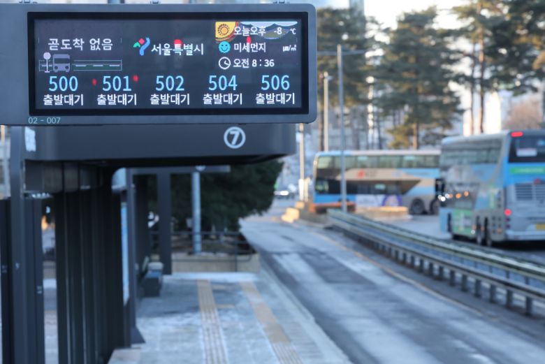 서울 시내버스가 파업에 돌입한 지난 13일 서울역 버스환승센터 버스정보안내판에 버스 위치가 '출발대기'로 표시돼 있다. /장경식 기자