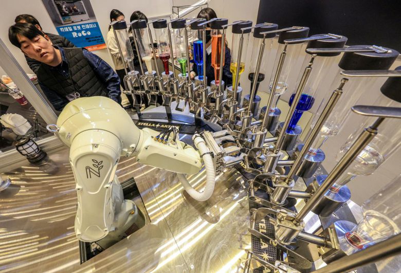 21일 서울 강남구 코엑스에서 열린 ‘2026 호텔페어’를 찾은 방문객들이 칵테일 제작 로봇을 관람하고 있다. 23일까지 열리는 이번 전시에는 호텔 운영을 비롯해 공간·인테리어, 서비스, 어메니티, 정보기술(IT)·스마트 솔루션 등 호텔·산업 전 분야를 아우르는 기업들이 참가한다.